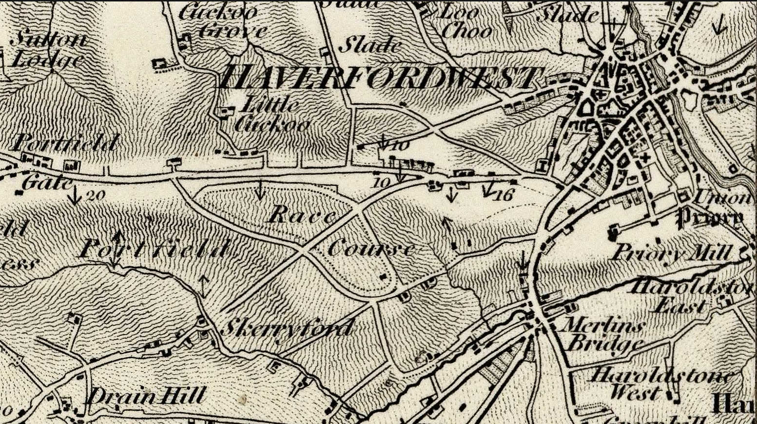 Horse racing in Wales followed a similar pattern to that in the rest of the country and developed primarily as a pursuit of the gentry initially with organised point-to-point meetings. It is believed the first racecourse in Haverfordwest was established at Portfield around 1727 (nearly 300 years ago) with racing taking place at that time but it was 1768 before races were recorded. The original course covered a very large area extending from what is now the Belle Vue running west as far as Portfield Gate and south as far as Merlin’s Bridge but by 1829 racing took place on a purpose built course which is the racecourse we know today. You can get an idea of the layout of original racecourse here;